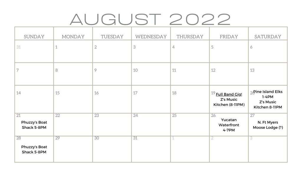 Schedule Original Music Gigs: 8/19 – Z’s Music Kitchen (Naples) / 8-11PM 9/9 – Ferg’s (St. Pete) / 7PM Share this: Click to share on X (Opens in new window) X Click to share on Facebook (Opens in new window) Facebook Like Loading...